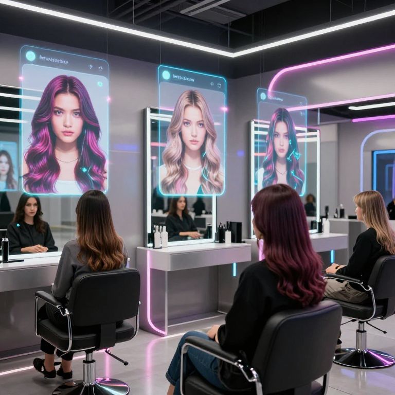 A futuristic beauty studio where apps to try different hair colors are projected holographically around clients with changing hair hues in real-time, neon lights, sleek design, hyper-detailed, sci-fi and cyberpunk aesthetics.