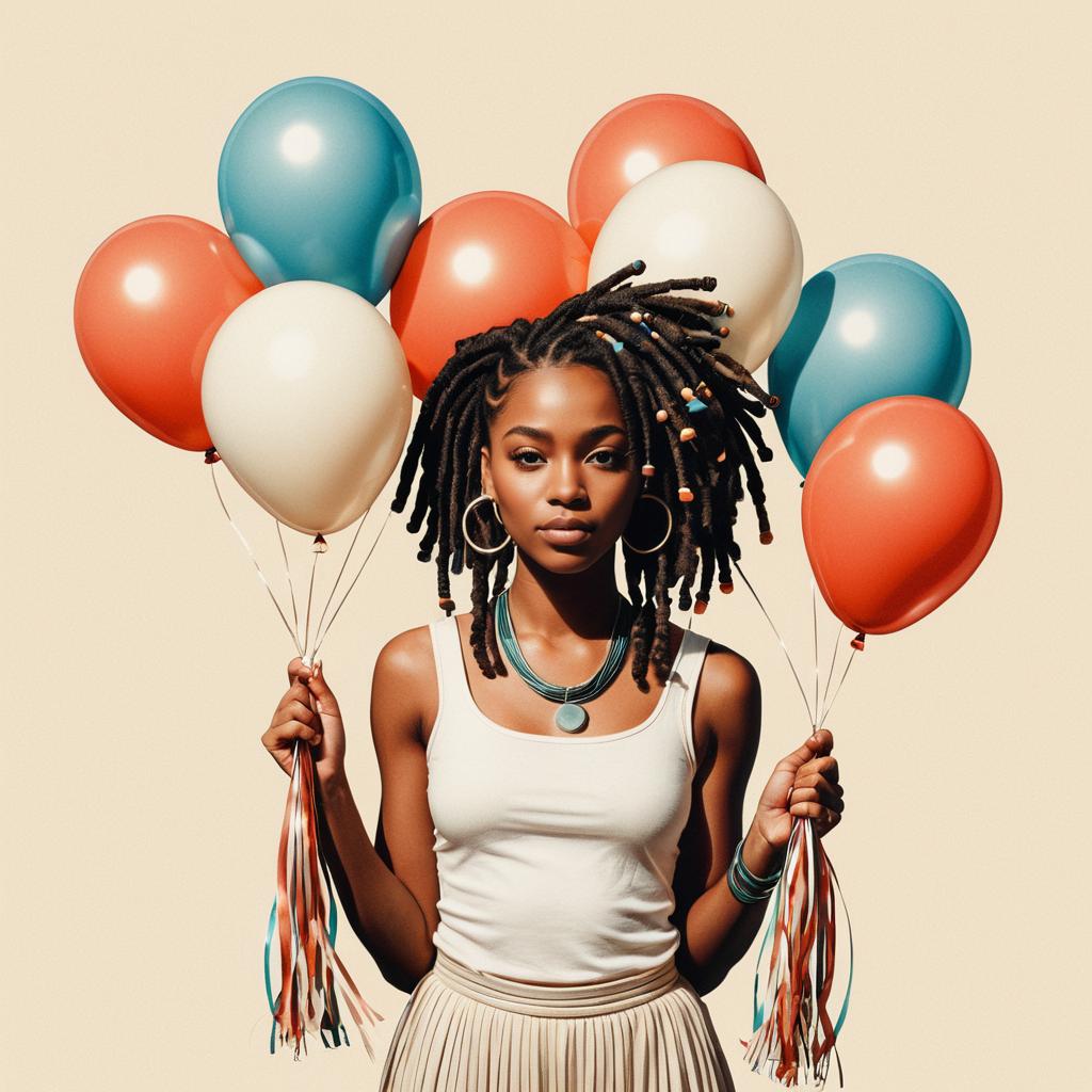 An Afrofuturism-inspired illustration of a young woman with dreadlocks holding helium balloons. Set against a ivory and coral background, the design emphasizes bold and elegant features in a stylized, vibrant art form.