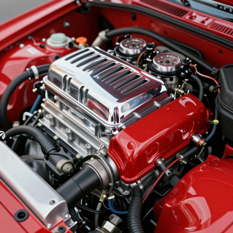 Close-up view of a meticulously maintained high-performance car engine, featuring a polished chrome air filter housing, dual carburetors, and intricate wiring and hoses, all nestled within a vibrant red engine bay.