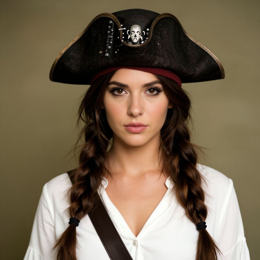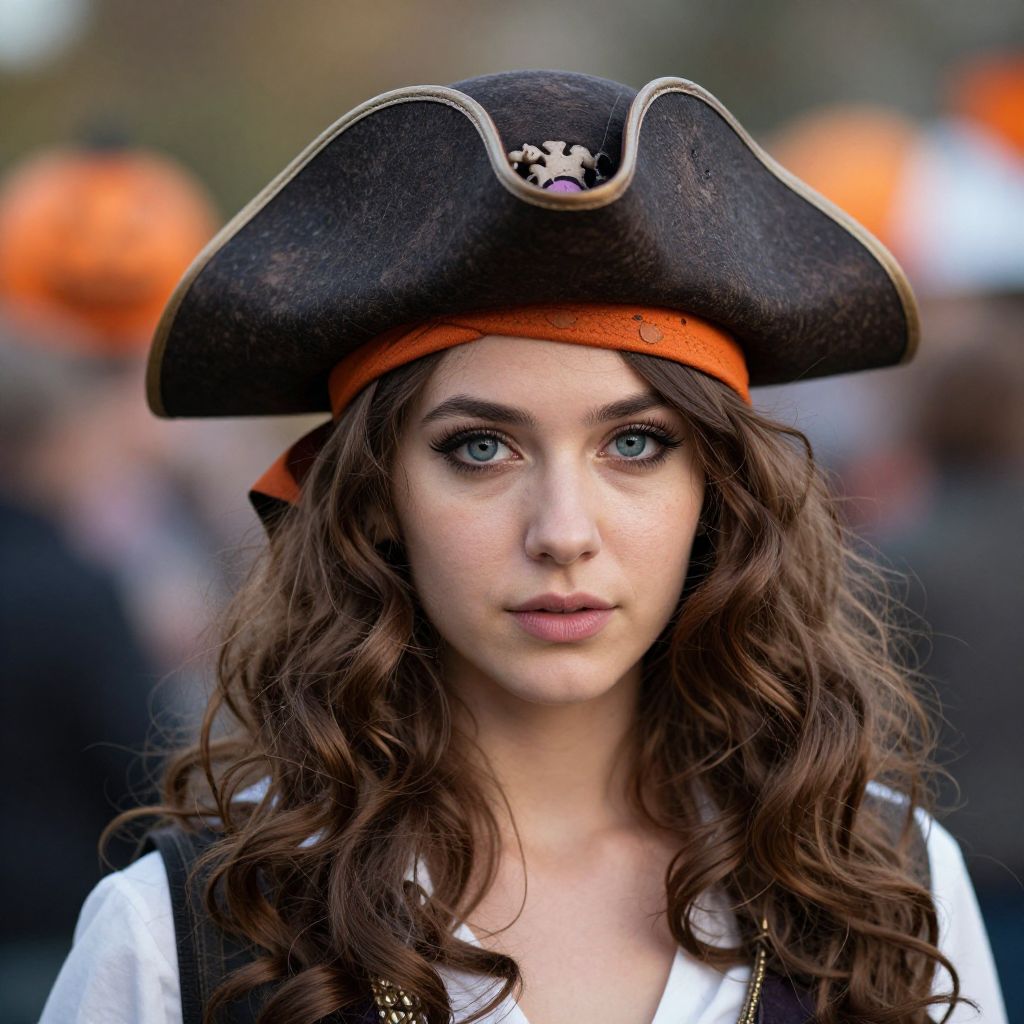 "captain hook halloween, solo, hat, pirate, 1girl, pirate hat, blue eyes, brown hair, upper body, looking at viewer, bicorne, curly hair, realistic, blurry, blurry background Realistic photo of casual sexy person with pretty face"