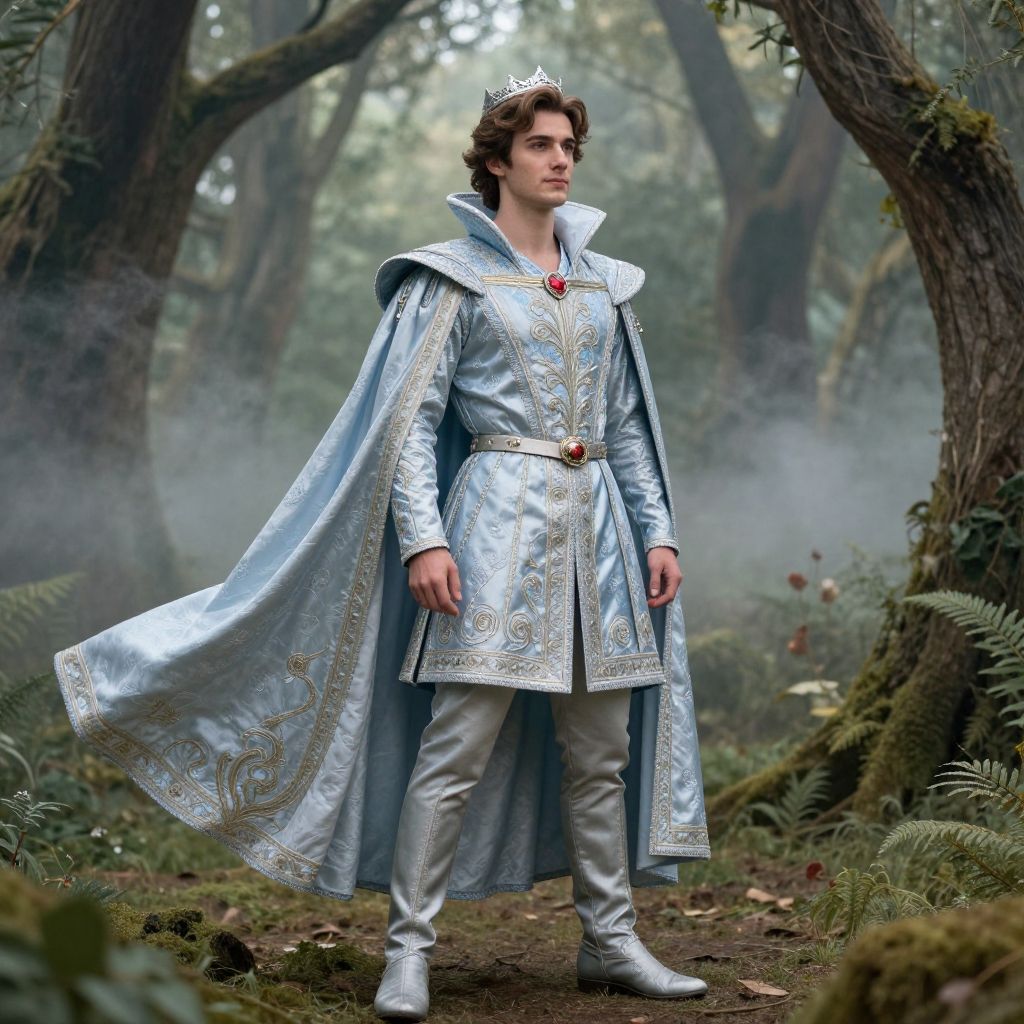 Snow white prince costume worn by a young man in a magical forest, intricate royal embroidery with silver and blue accents, flowing cape, medieval tunic and boots, soft natural lighting with ethereal mist surrounding, fantasy portrait style