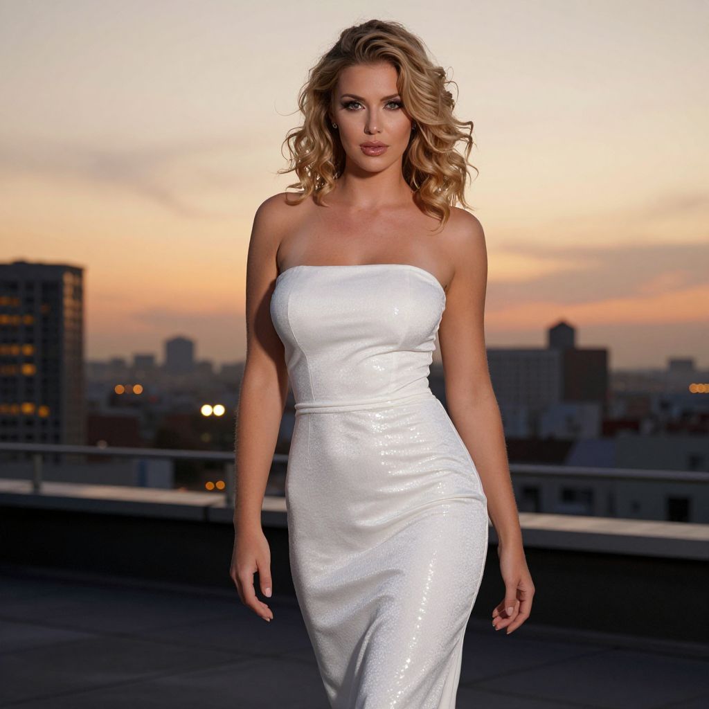 A tall, slender woman with curly blonde hair and green eyes wearing a stylish white bandeau dress costume, posing on a rooftop at sunset with city lights reflecting in the sky, the dress shimmering slightly under the golden hour light, the setting evoking a modern fantasy theme.. The woman has big tits and cute face