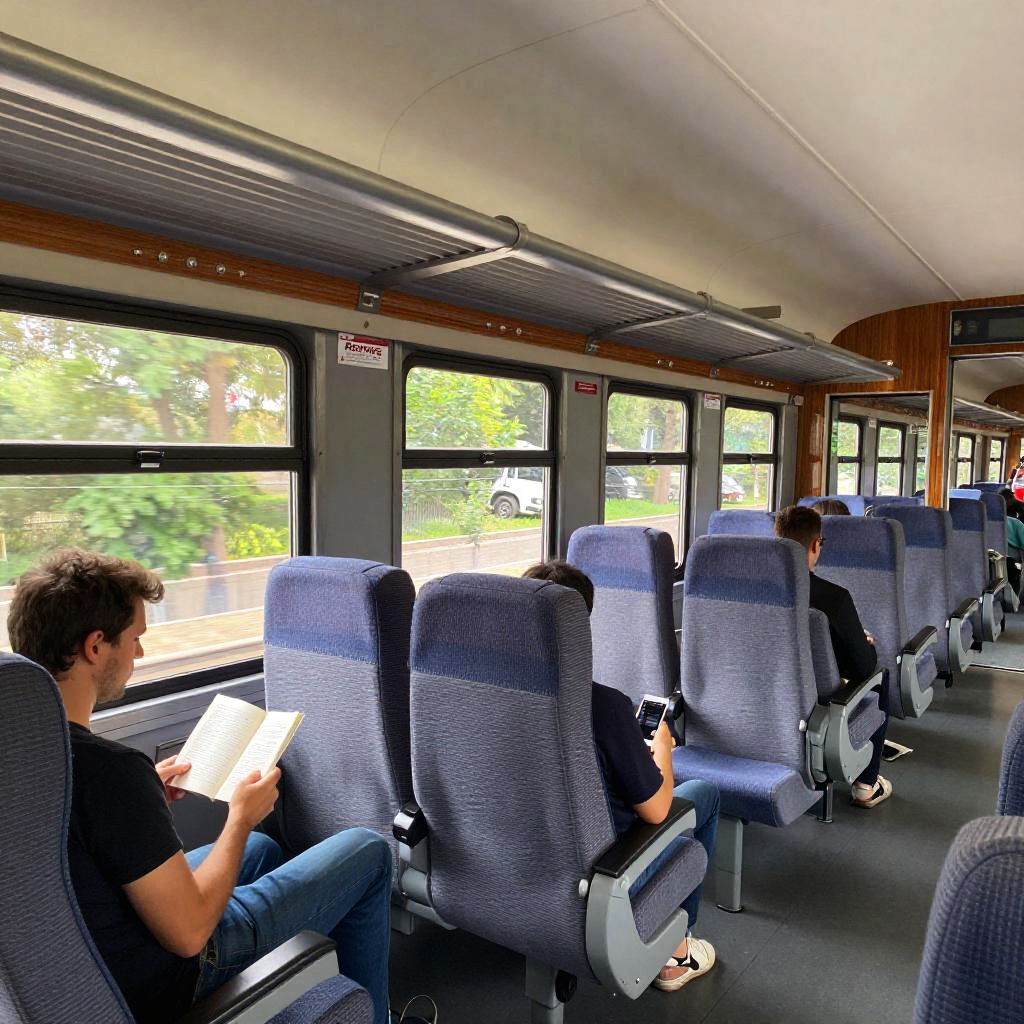 Renfe train interior at night, illuminated by soft blue and white LED lights, high-tech control panels, plush seating layout, reflections on polished surfaces, modern and futuristic travel environment