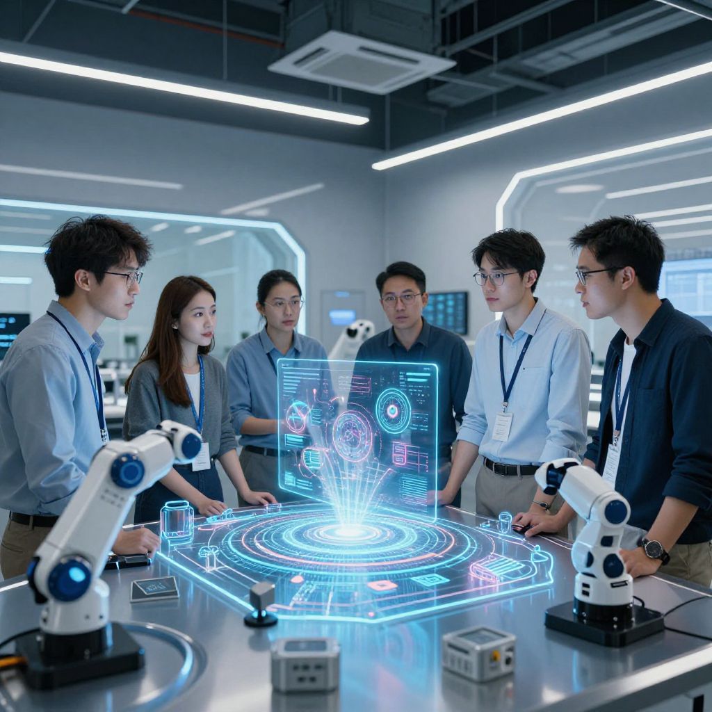 Pwc innovation lab scene, engineers and designers brainstorming around 3D holographic models, advanced robotics and AI elements present, cool blue and white color palette, high detail, dynamic composition, light rays reflecting off metallic surfaces