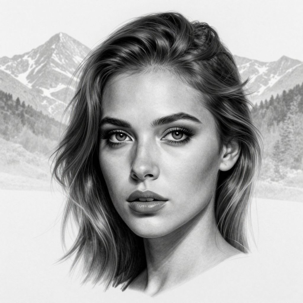 Tattoo design sketch of a beautiful woman face with a faded background of beautiful mountains and nature on the side, hyper - realistic, in the style of den yakovlev, amazing detail, black and white