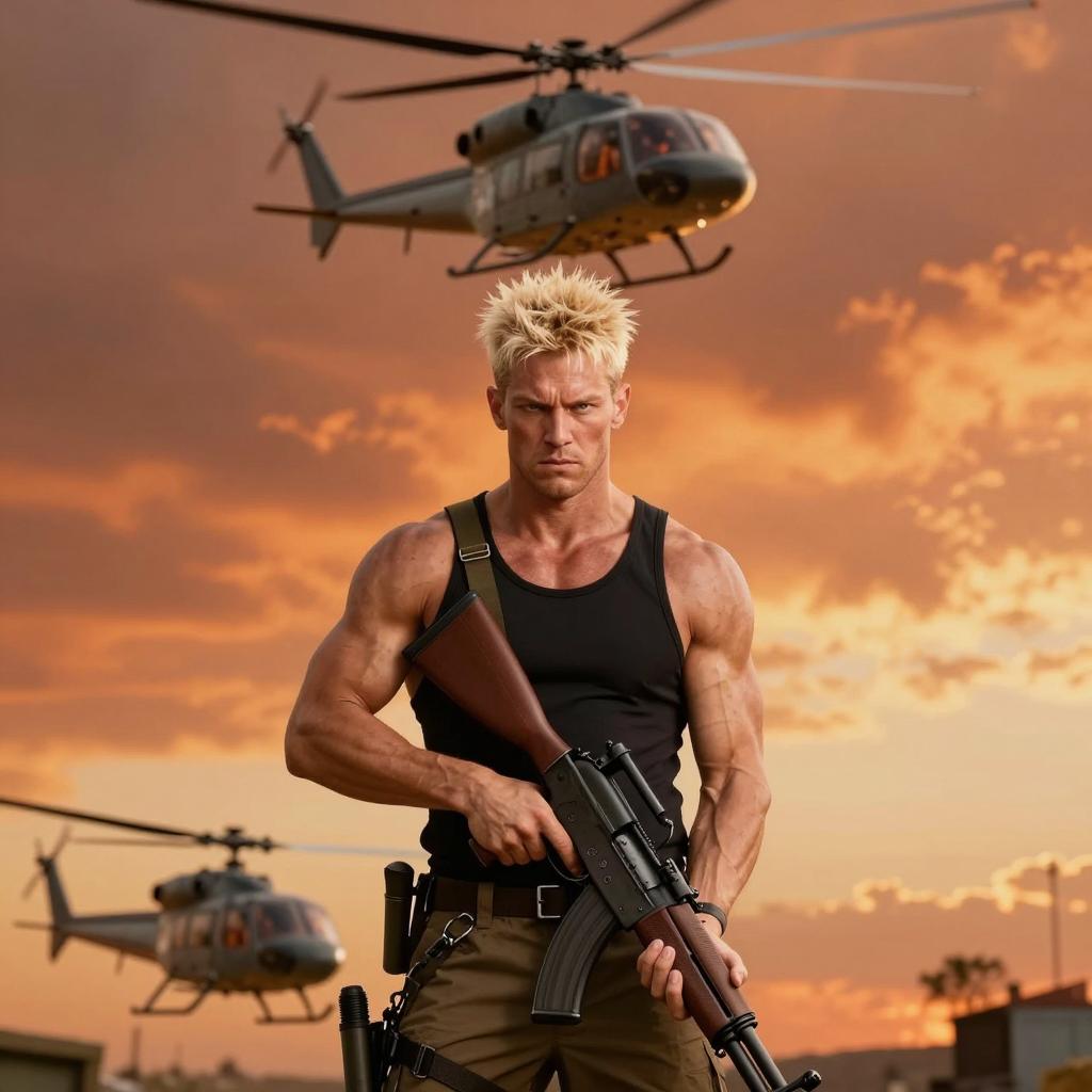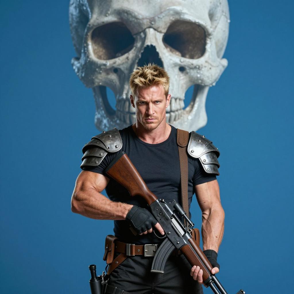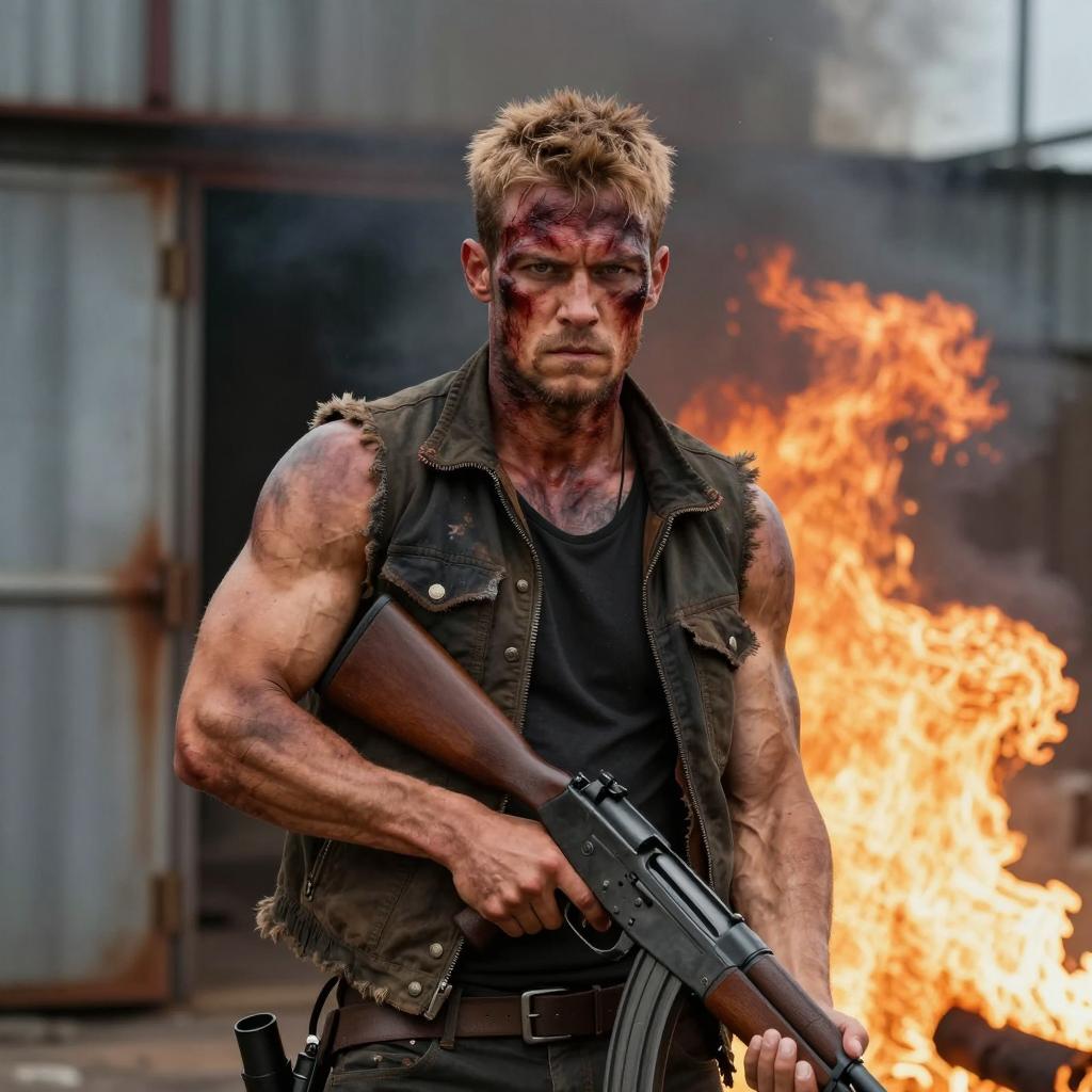 Muscular man with dirty, blood-streaked face and short blonde hair, holding a rifle. Wearing dark, tattered vest. Background has large, burning fire on the right, industrial metal doors on the left. Man's expression is intense. Smoke rising from fire.