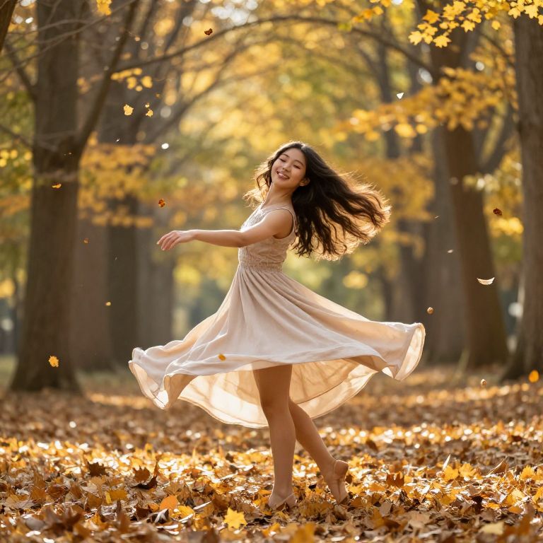 Youn, a joyful young dancer in a flowing dress spinning in a forest clearing during autumn, golden leaves swirling around her, soft dappled sunlight filtering through the trees, capturing movement and grace.