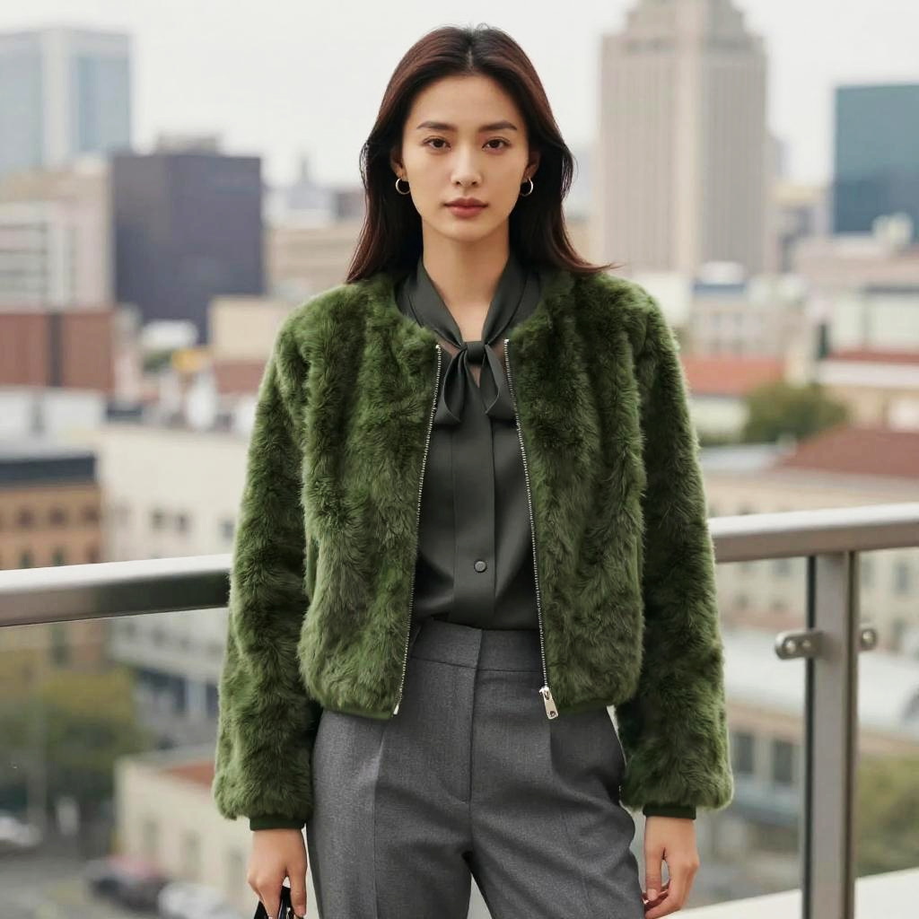 Photograph of an Asian woman with straight black hair, red lipstick, wearing a dark green velvet blazer, standing on a rooftop at dusk with city