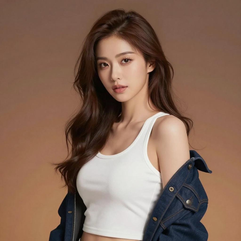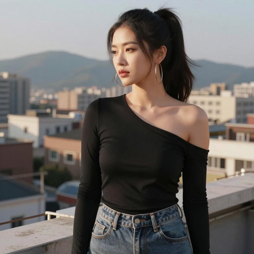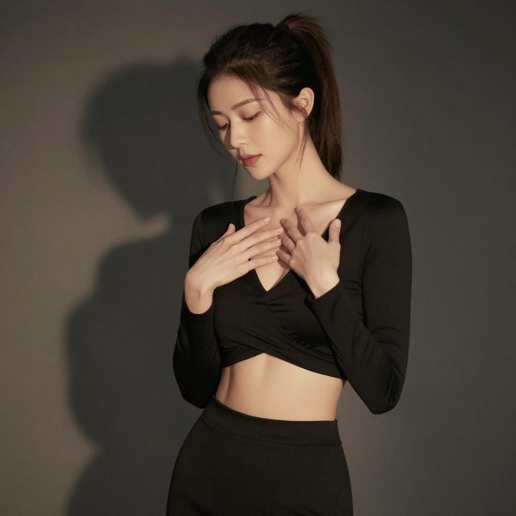 Photograph of an Asian woman with fair skin and black hair in a high ponytail, wearing a black, deep V-neck, long-sleeve top with cutouts, and a matching skirt. She stands against a dark background, hands gently touching her chest, eyes closed, and lips slightly parted. The lighting casts a shadow on the wall behind her.