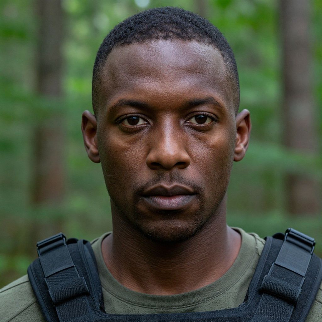 Photograph of a serious-looking African-American man with short-cropped black hair and a trimmed beard. He has a medium-dark skin tone and is wearing a green military-style shirt with black tactical gear straps over his shoulders. His expression is neutral, with slightly furrowed brows and a subtle frown. The background is a blurred forest with green foliage, creating a natural, outdoor setting. The image is sharply focused on his face, highlighting his smooth skin texture and subtle facial features. The lighting is natural, enhancing the realistic and authentic feel of the portrait.