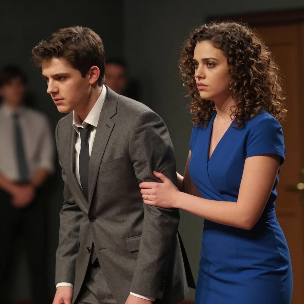 Man in dark suit with blue tie, medium build, pale skin, brown hair, standing and looking at woman. Woman with curly brown hair, medium build, pale skin, wearing red dress, holding his hands, standing. Bar background with gold decor, plants, ice bucket, and red-patterned couch. Man has neutral expression, woman looks at him with focus. Both facing each other, standing upright. Two people.