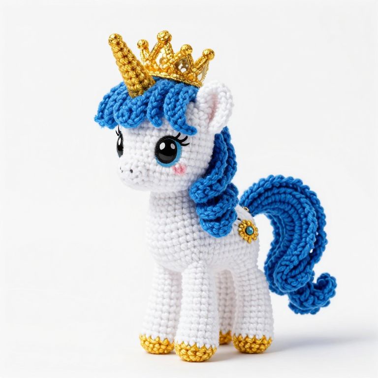 Photograph of a white, blue-maned crochet unicorn with a golden crown, blue tail, and hooves, standing on a white background.