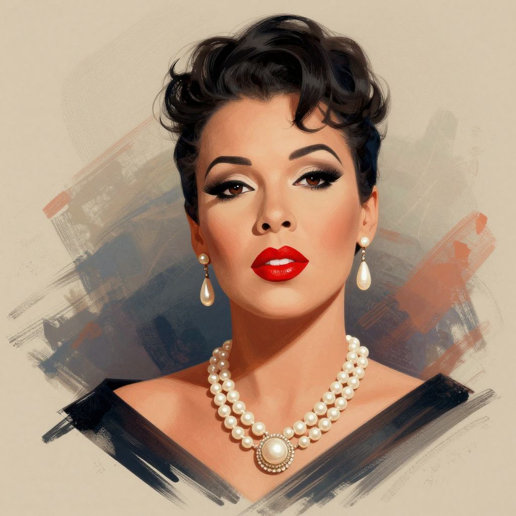 A vibrant digital illustration inspired by the elegance of Billie Holiday, featuring a woman with striking red lipstick and pearl jewelry against a textured, painterly background with dynamic brushstrokes and a retro aesthetic.