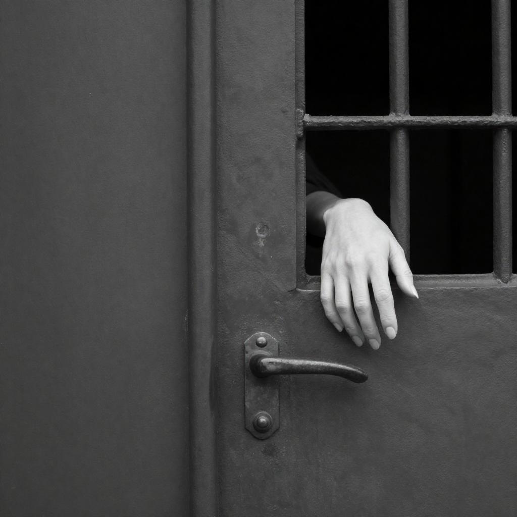 Black-and-white photograph of a weathered, ured metal door with a curved handle. A white, ghostly hand with elongated fingers reaches through a small, barred window from the right side. The door's rough surface contrasts with the smooth, eerie hand. The handle is positioned lower left, while the window is upper right.
