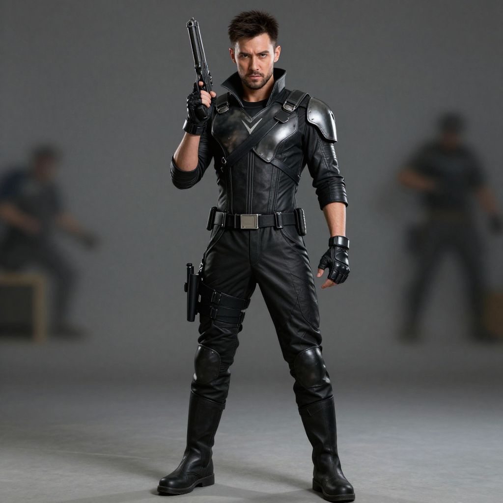 Metal gear solid costume, gloves, male focus, weapon, gun, 1boy, facial hair, holster, jacket, boots, fingerless gloves, solo focus, pants, holding weapon, black gloves, holding, holding gun, standing, blurry background, handgun, short hair
