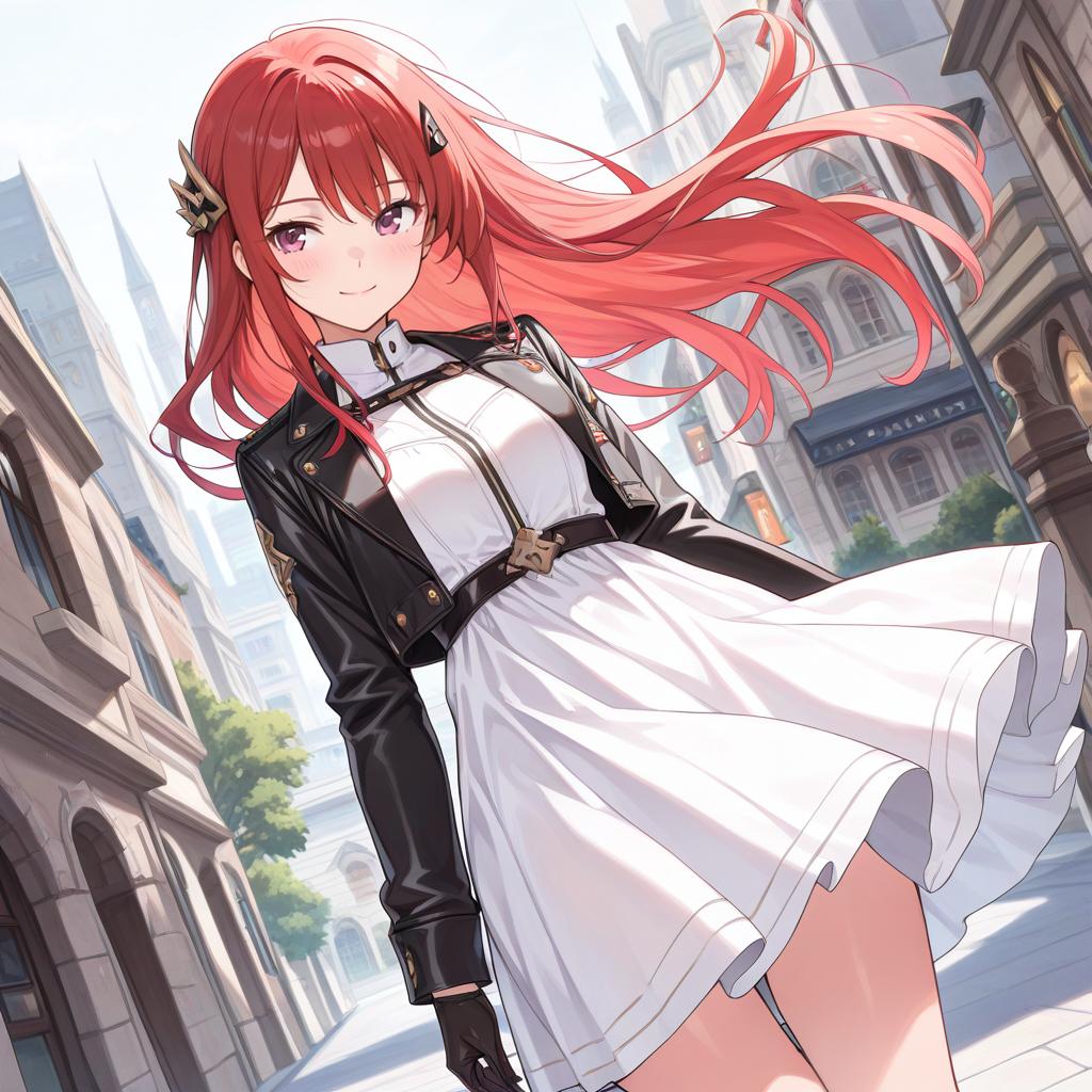 Hapi (fire emblem), fire emblem, 1girl, dark-skinned female, red eyes, red hair, long hair, navel, garreg mach monastery uniform, uniform, garreg mach monastery uniform, uniform, crop top, midriff, by artist anzu (o6v6o), dark_illustrious