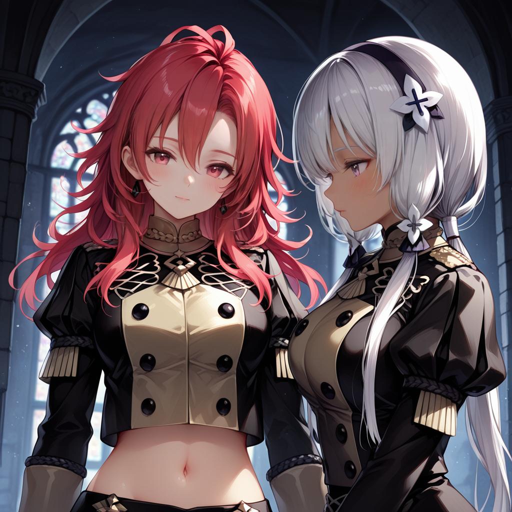 Digital artwork of a dark-skinned female anime character with long red hair and red eyes, wearing a cropped Garreg Mach Monastery uniform with a midriff exposed. She stands inside a gothic-style stone building with arched windows, showcasing detailed elements like buttons and decorative accents on her black and beige outfit.