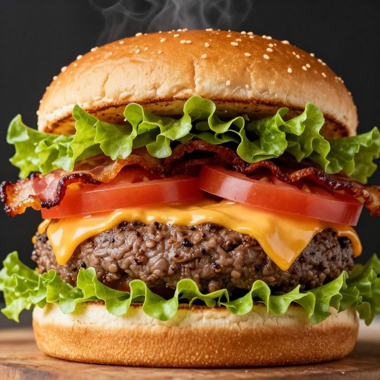 Yum concept with a close-up of a mouthwatering gourmet burger stacked with fresh lettuce, juicy tomato, melted cheese, and crispy bacon, steam rising, rich vivid colors, hyper-realistic style with a focus on textures and appetizing detail