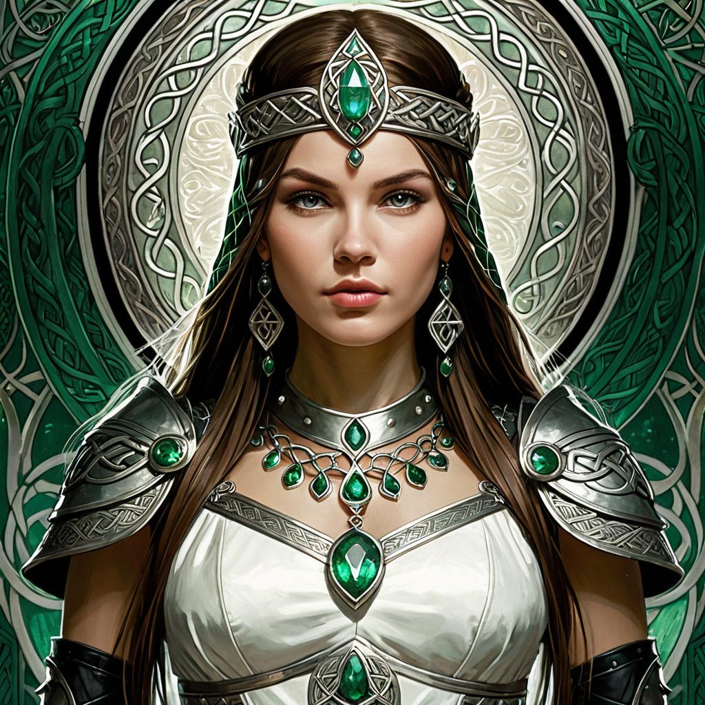 Expressive oil painting of regal Celtic warrior princess, defiant intense stare, smooth glowing skin, glistening body, love, adoration, blushing, ornate circlet made of silver and emeralds, glamour shot, slim, by alphonse mucha, yoshitaka amano, digital art, octane render, leather armor over white dress