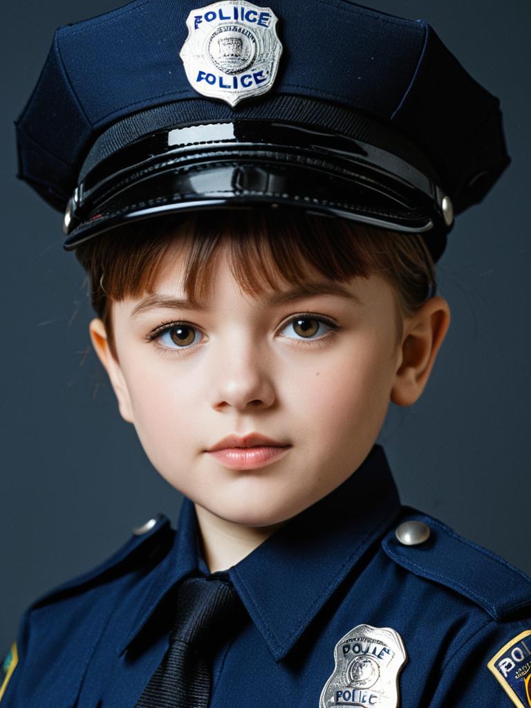 Child in Police Officer Costume, close-up detailed headshot with uniform detail