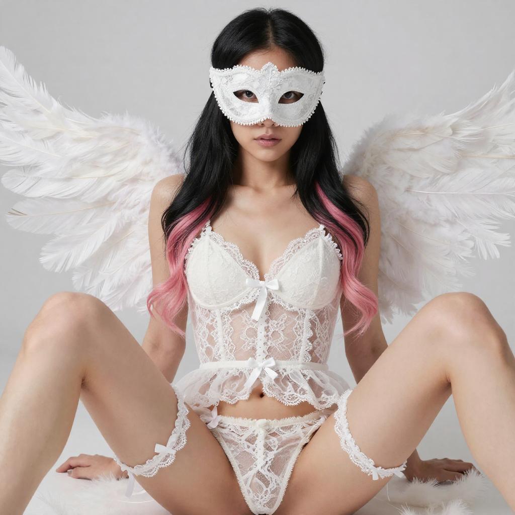 Photograph of an Asian woman with long black hair and pink highlights, wearing a white lace babydoll and matching garter, sitting with legs spread. She has a white mask with lace patterns, and a visible erect penis is between her legs. White feathers are in the background.