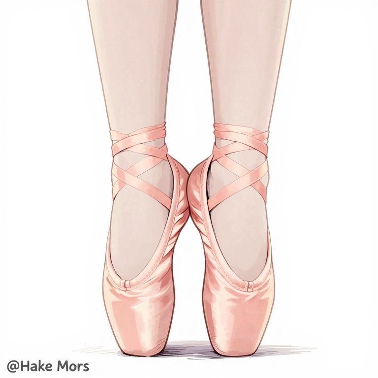 Illustration of ballet shoes with intricate pink laces crisscrossing above the ankles, showcased on a white background with artist credit \"@Hake Mors\" in the bottom left corner.