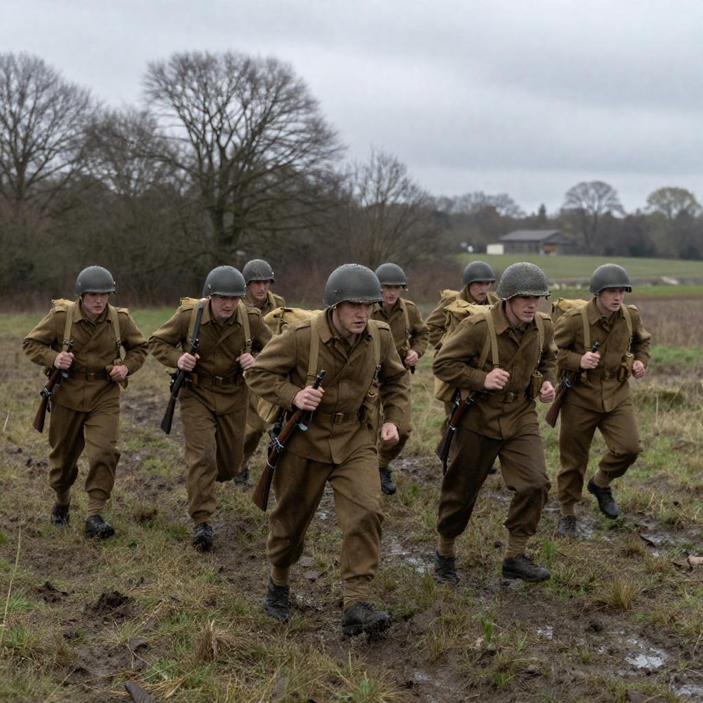 Photograph of six male soldiers in WWII-era uniforms, helmets, and green gloves, advancing with rifles. Foreground soldier with intense expression, leading others. Forest background, muddy terrain, and fallen leaves. Soldiers in varied positions, some looking ahead, others to the side.