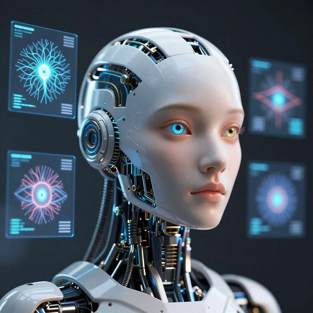 Realistic vision AI concept showing an advanced artificial intelligence system with a human-like eye embedded in a sleek mechanical head, surrounded by holographic projections of neural networks and simulated vision data, ultra-realistic rendering with depth and reflection.