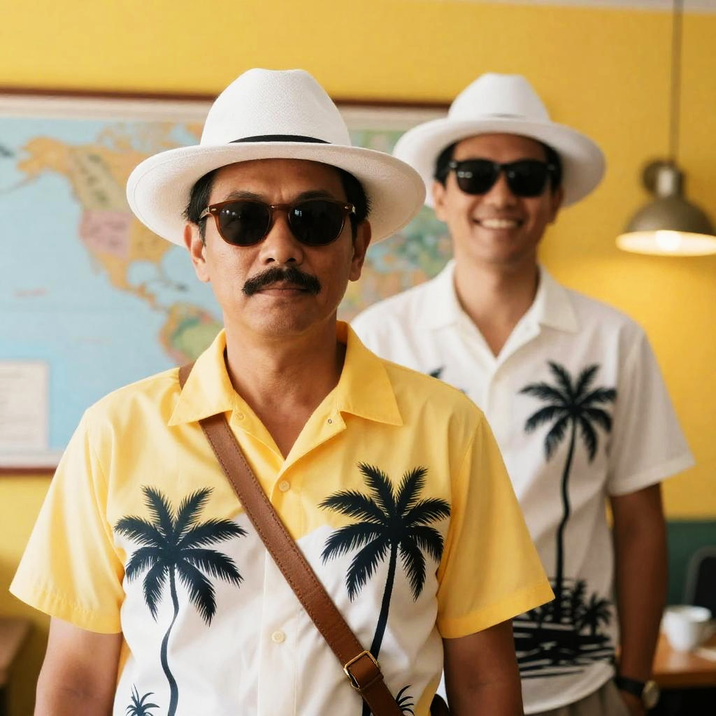 Two men in retro outfits. First man: white hat, dark sunglasses, yellow and white shirt with palm trees, brown crossbody bag, mustache. Second man: white hat, black sunglasses, white shirt with palm trees, smiling, standing behind. Yellow wall with maps and a desk lamp.