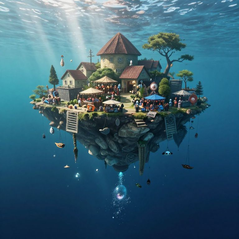 This CGI image depicts an underwater village floating above a rocky base. The village features a central, large, yellow house with a red roof, surrounded by smaller houses and trees. Sunlight penetrates the blue water from above, illuminating the scene. The village is bustling with animated characters, some standing under umbrellas, others near a dock with a boat. Fish and bubbles float around the submerged base, which has ladders and signs. The image has a whimsical, fantasy style, blending realistic textures with imaginative elements, and is highly detailed with vibrant colors.