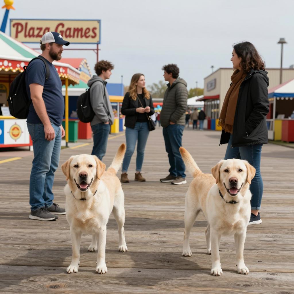 Two Yellow Labradors on Boardwalk with People and Carnival Games