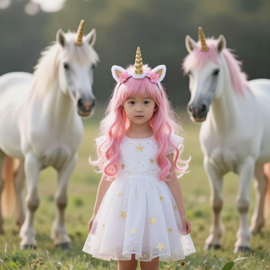 Baby unicorn princess, photograph of a cute little girl with long pink hair, wearing a white dress with gold star patterns, and a unicorn headband with pink flowers, standing in a grassy field with two white unicorns with pink manes in the background, sunlight, soft focus, pastel colors, magical, fantasy, whimsical, child, unicorn costume, fairy tale setting