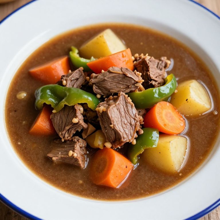 Savory Antelope Venison Stew with root vegetables, including carrots, potatoes, and green bell peppers, simmered in a rich brown broth, presented on a white plate with a blue rim.
