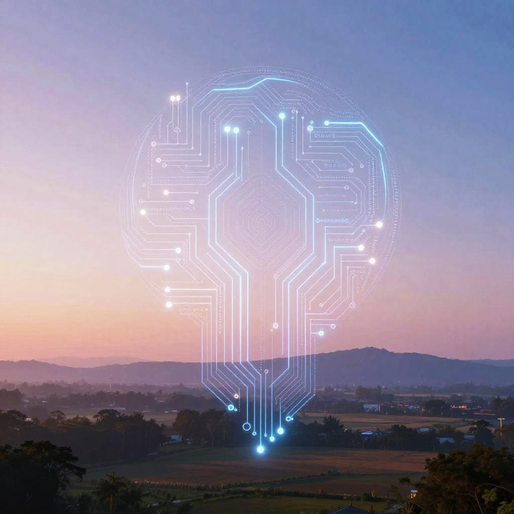 Abstract digital entity representing artificial intelligence composed of luminous circuit patterns and swirling data threads floating above a tranquil rural landscape at sunrise. The image blends technology and nature with soft pastel tones and a dreamlike atmosphere, symbolizing harmony between AI and the natural world.