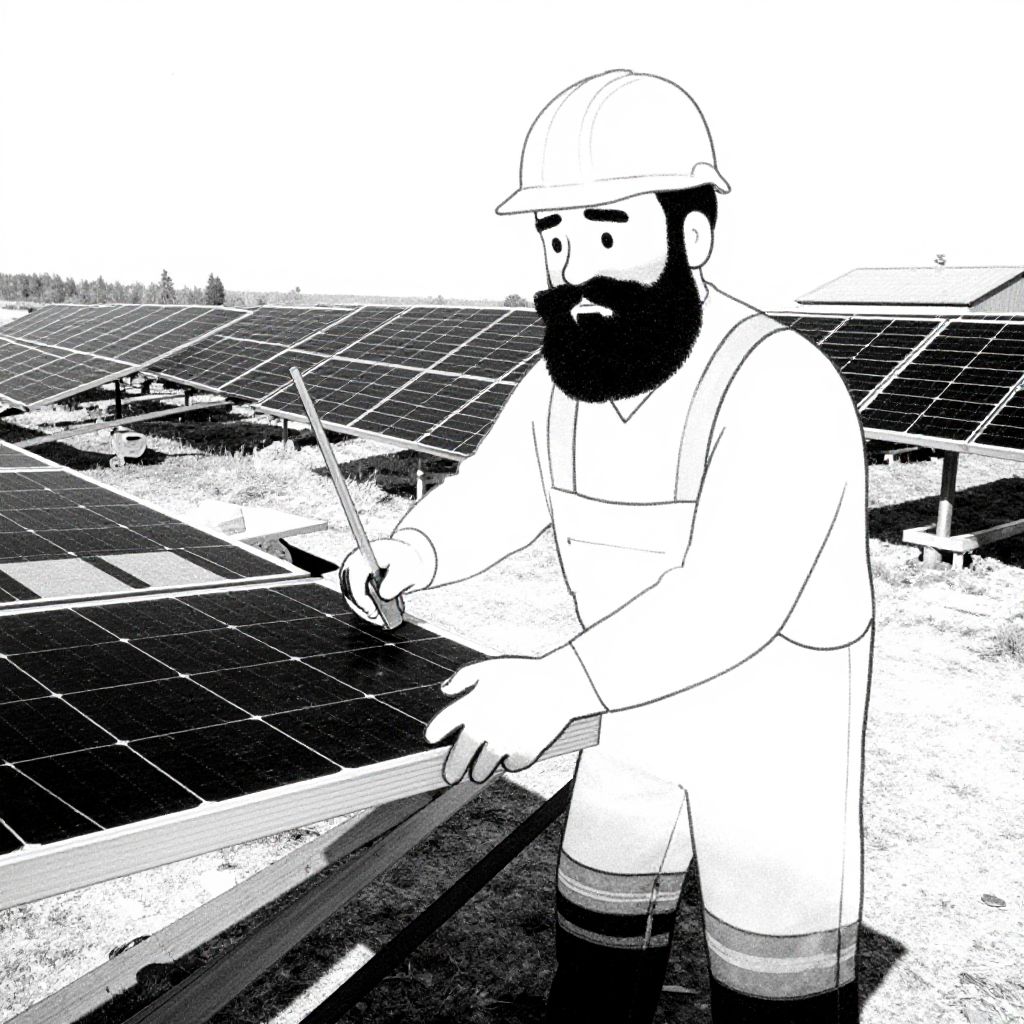 Black-and-white digital drawing of a bearded worker in helmet and protective gear installing solar panels on a rooftop. Bold, simplistic style.