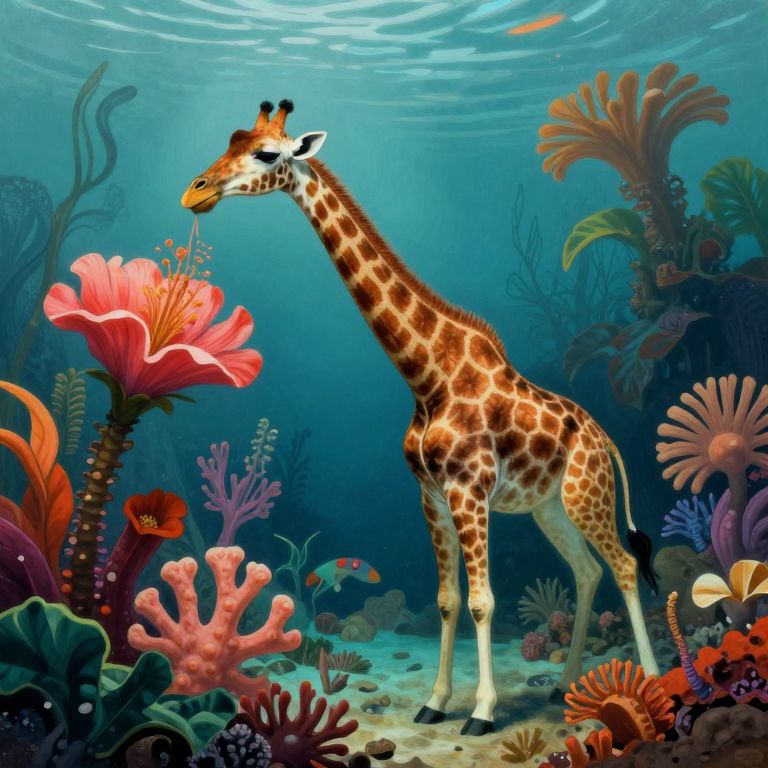 Imagine an alluring underwater tableau reminiscent of Henri Rousseau's coral reef paintings, where an exotic marine creature resembling a fanciful giraffe gracefully glides through the water. Amidst vibrant, oversized tropical flora, this enigmatic sea beast stretches its elongated neck to pluck a radiant bloom from the lush surroundings. The scene captures a surreal fusion of wonder and intrigue as it portrays this whimsical creature in a mysterious aquatic realm filled with oversized blooms and plants, creating an enchanting visual tapestry that blurs the lines between reality and imagination.