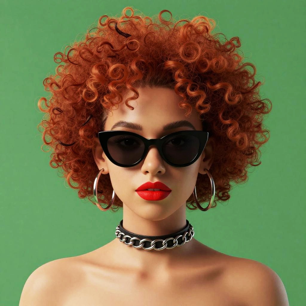 This is a digital CGI portrait of a stylish woman with a voluminous, curly red afro and braided side undercut. She's wearing black, cat-eye sunglasses and a black choker with a silver chain. Her lips are painted a bold red. She's also sporting large, silver hoop earrings. The background is a solid, bright green, making her features pop. The overall style is modern and edgy.