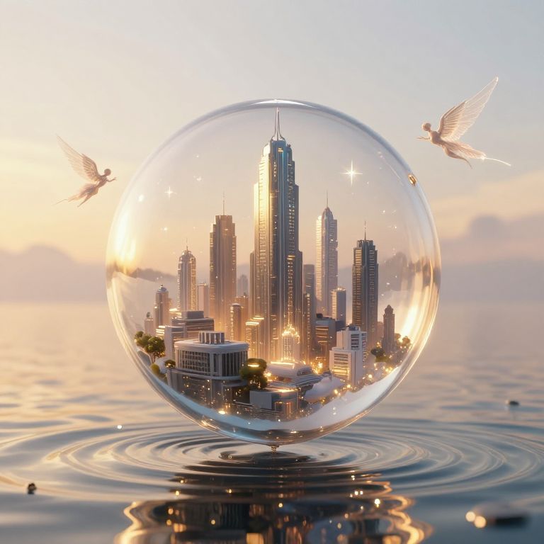 A futuristic cyberpunk cityscape, encapsulated within a transparent water droplet, floats serenely on a shimmering liquid surface, illuminated by golden-hour lighting and surrounded by delicate, winged figures sculpting ethereal structures from luminous starlight.