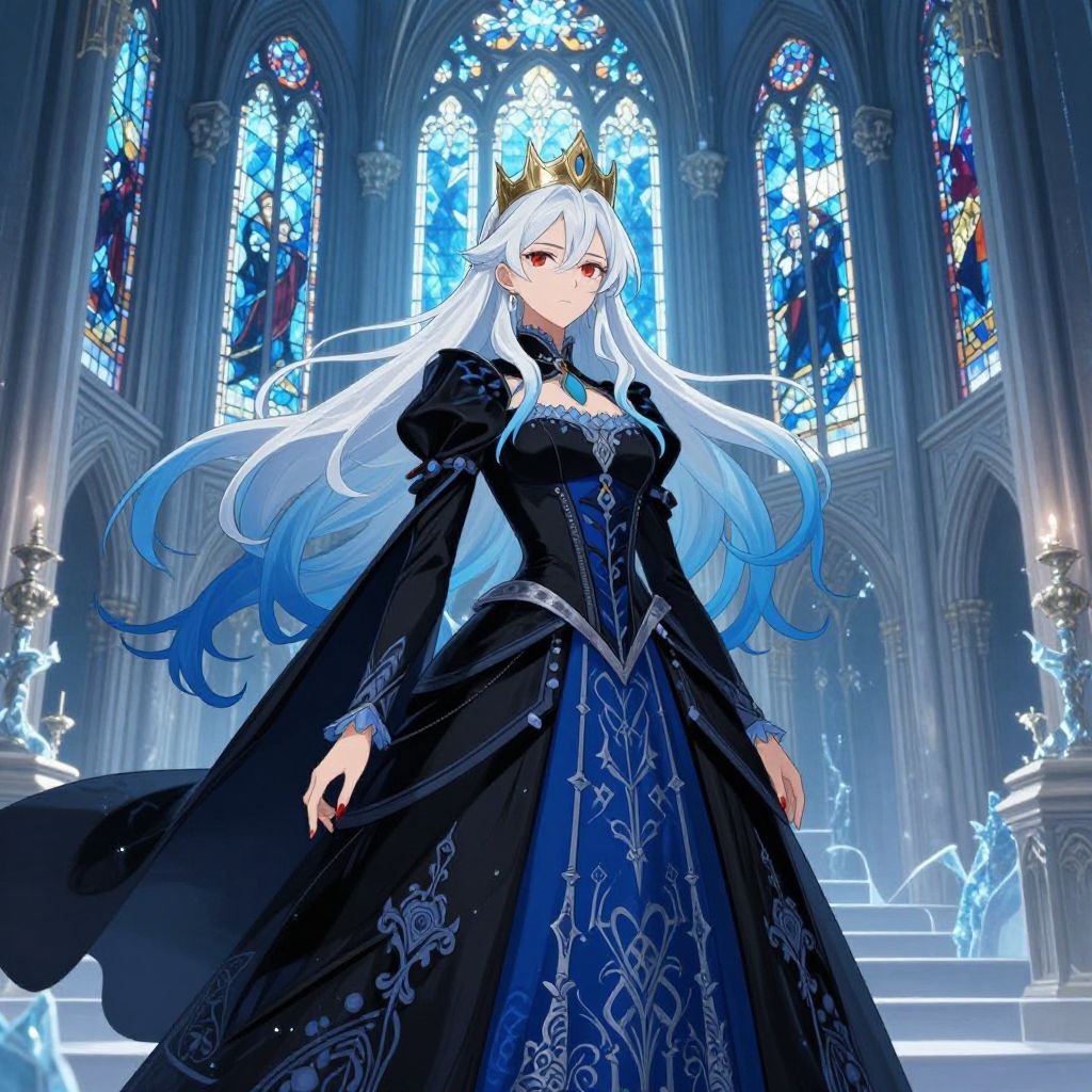 This digital anime-style drawing features a regal woman with long, flowing white and blue hair, wearing a black and blue gown with intricate patterns. She has a golden crown, pale skin, and red eyes, standing in a gothic, ice-blue stained glass cathedral. Her black cape billows dramatically behind her, adding a sense of power and elegance to her appearance.
