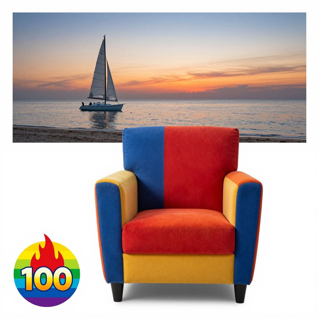 Photograph of a colorful, modern armchair with bold blue, red, orange, and yellow panels, set against a white background. Above the armchair, there's a photo of a serene beach at sunset with a single sailboat on the horizon. The sailboat is white with a curved sail, and the sky transitions from orange to blue. Bottom left features a vibrant, multicolored circular logo with a red flame and the number 100.