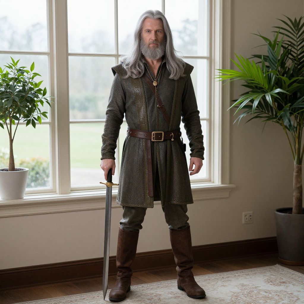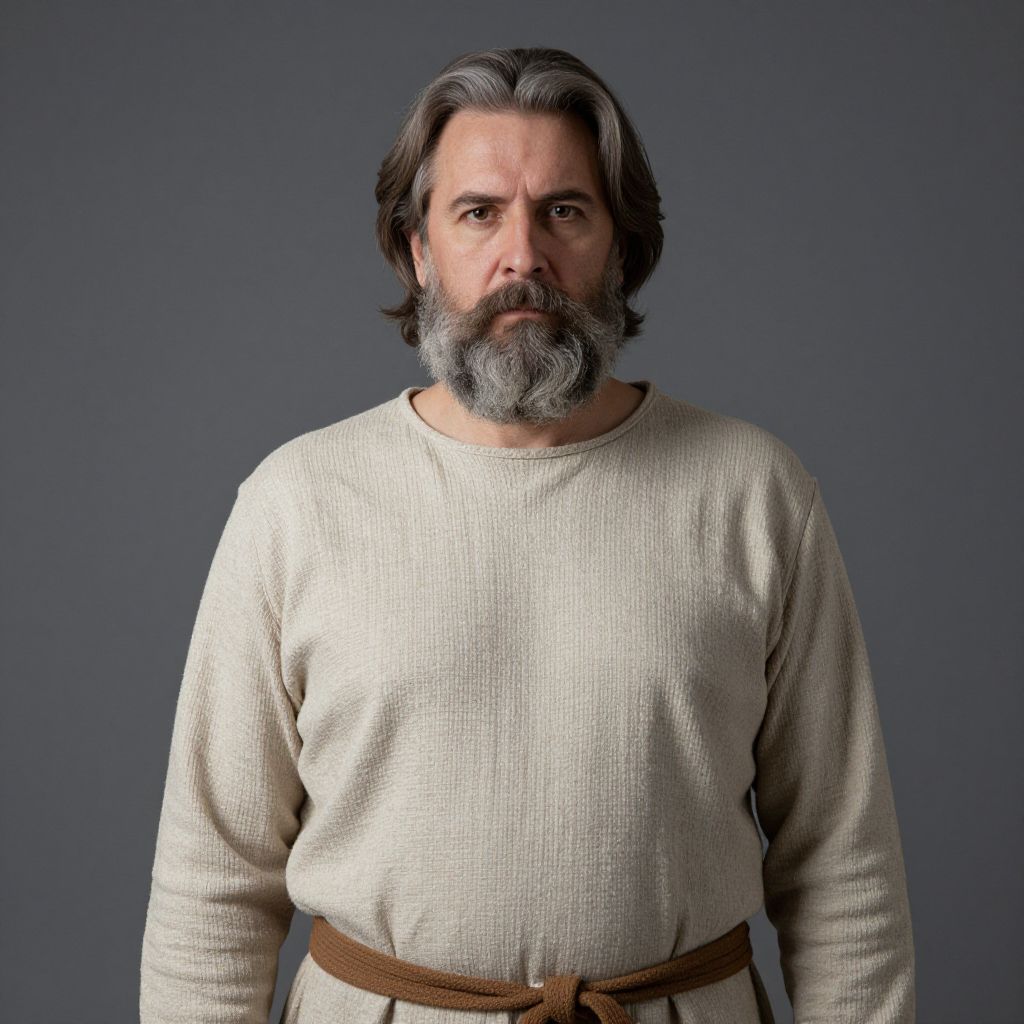 Photograph of a middle-aged man with gray, shoulder-length hair and a full gray beard. He's wearing a light beige, textured, long-sleeve tunic with a brown belt tied at the waist. His expression is serious, and he's looking directly at the camera. The background is a simple, solid gray. The overall style is classic and slightly rustic.