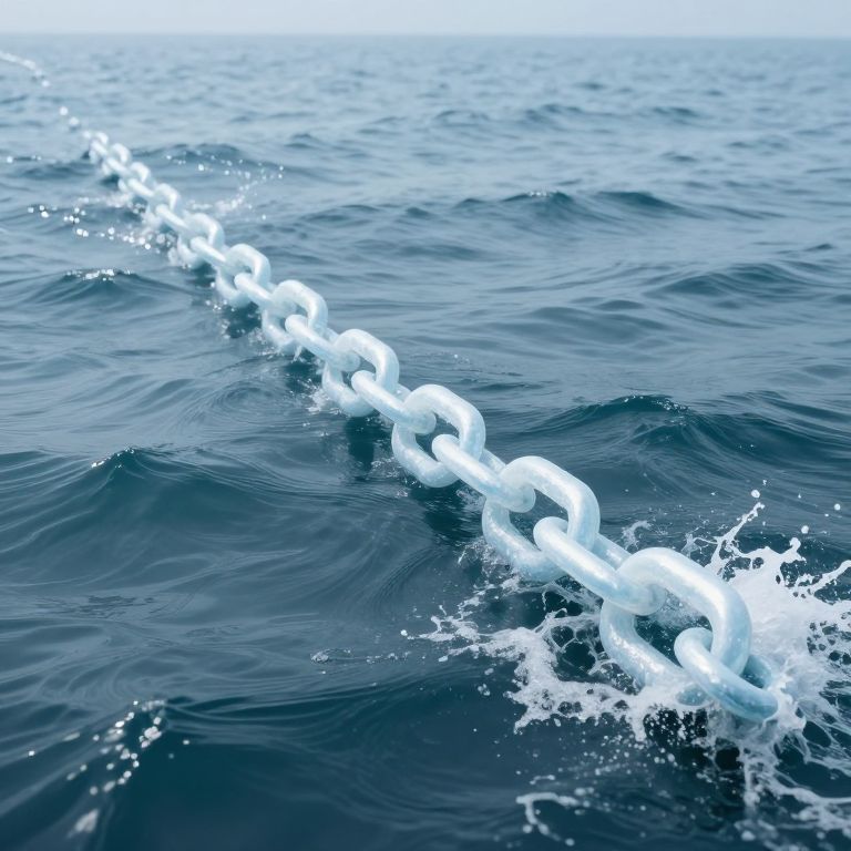 A massive, ethereal chain floats serenely across the ocean's surface, its links seamlessly merging with frothy waves as if crafted from the sea itself, defying gravity and reality alike.