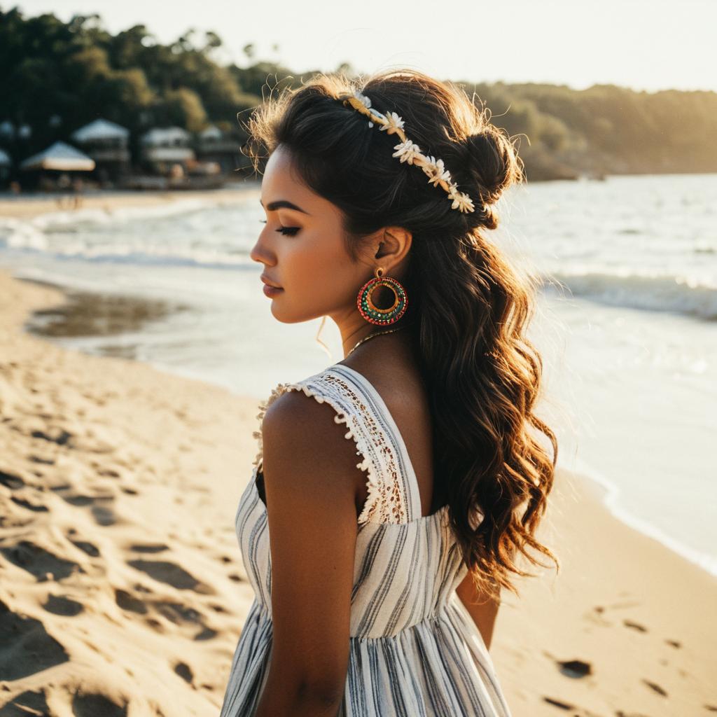 Ethnic woman with a boho half-updo hairstyle adorned with small white flowers, wearing a linen sundress with lace details, standing on a rustic beach during golden hour with warm sunlight illuminating her wavy hair.