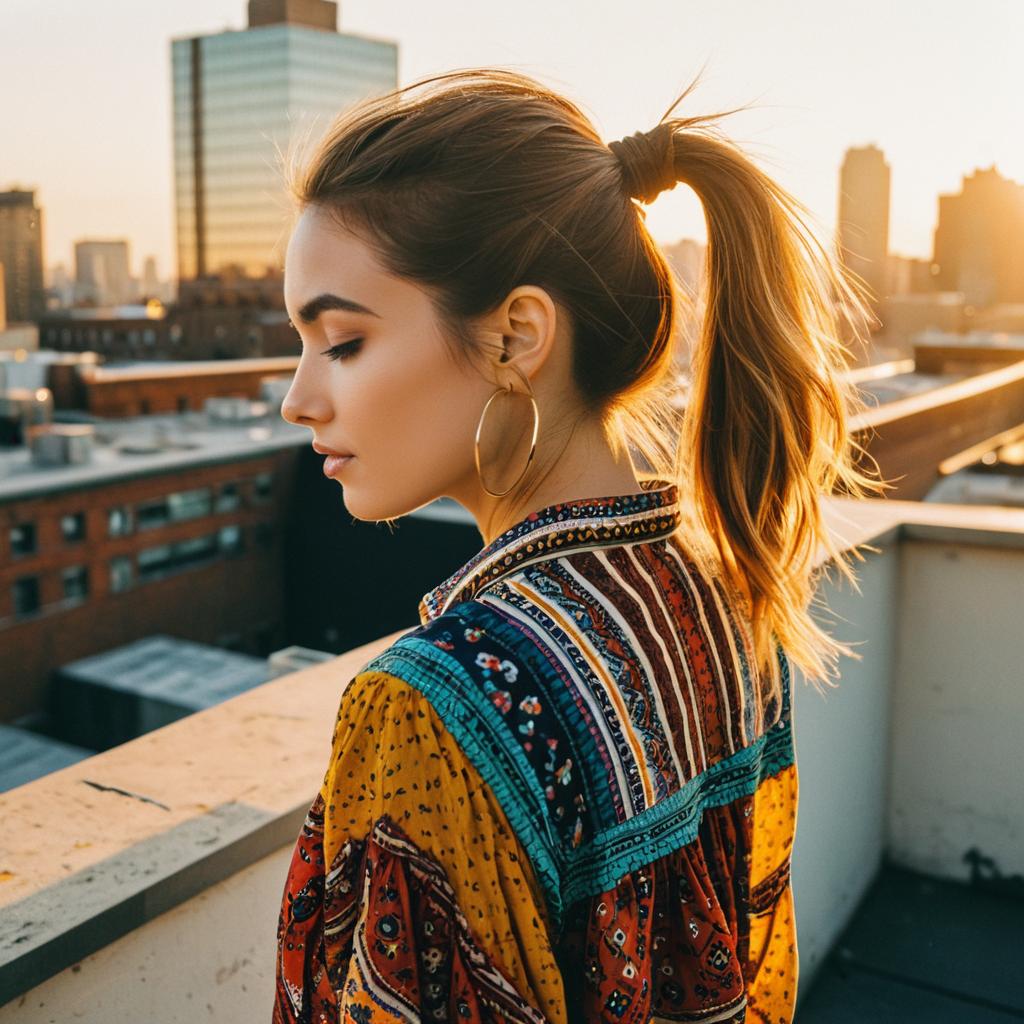 Boho Half-Updo hairstyle on ethnic woman, wearing linen sundress, in rustic beach, captured in fashion editorial style with warm sunlight.