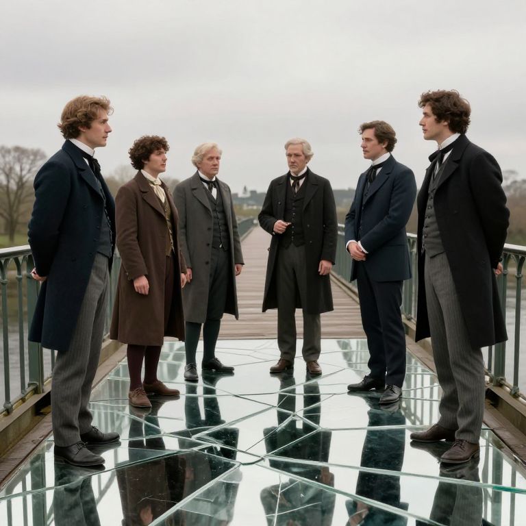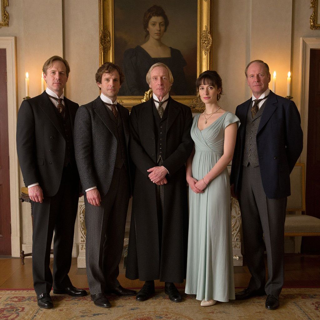 Elegantly dressed characters from *Howards End* stand side by side in a grand room, with a vintage portrait of a woman in the background and candles casting warm light to the right.