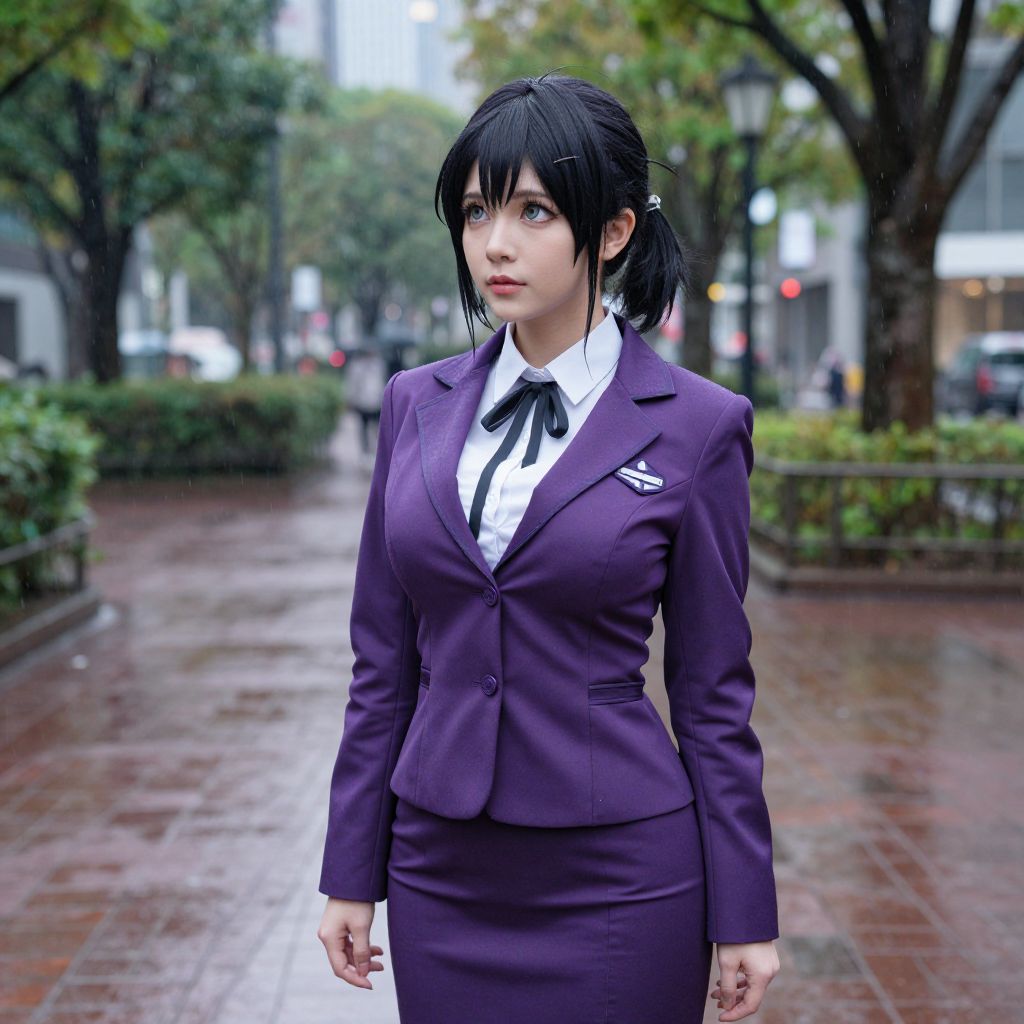 Photorealistic CGI of an Asian woman with black hair in a purple business suit, black ribbon tie, standing on a wet, tree-lined urban street