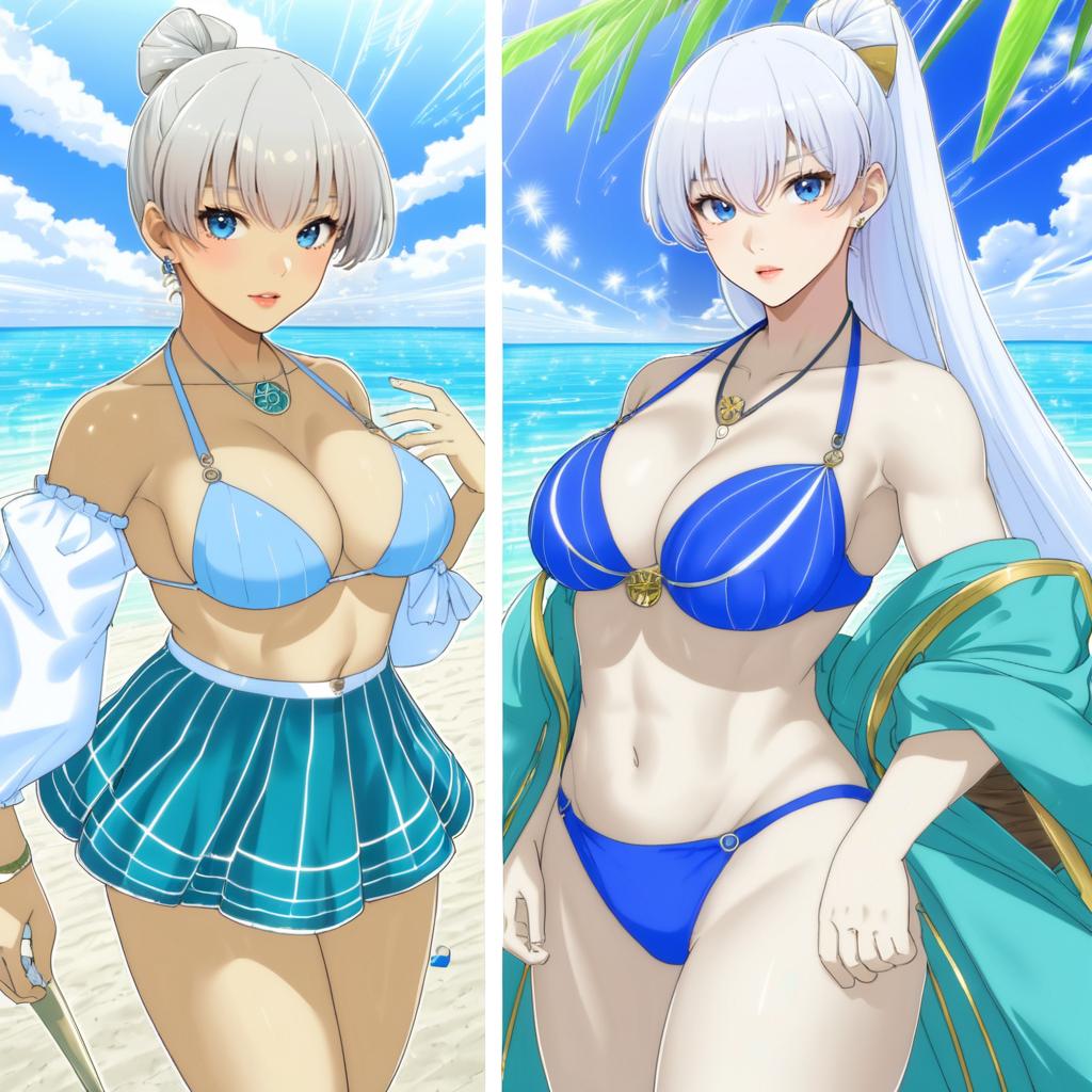 Anastasia (swimsuit archer) (fate), fate/grand order, 1girl, blue eyes, hair over one eye, very long hair, white hair, grey hair, ponytail, hair bow, large breasts, medium breasts, cleavage, thighs, navel, collarbone, blue bikini, blue skirt, bare shoulders, puffy long sleeves, necklace, beach, by artist aestheticc-meme, animagine