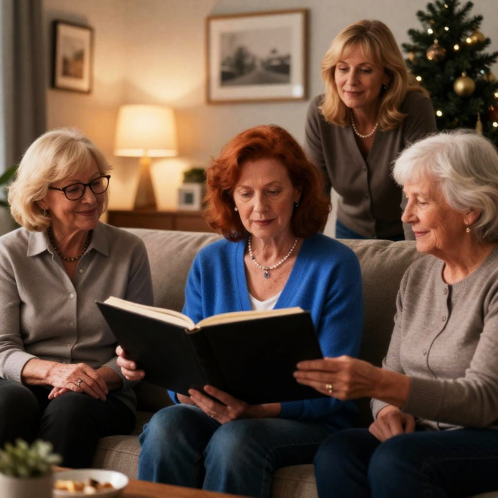 Four older women sitting on a couch in a cozy, dimly lit room. One with red hair in a blue cardigan, center, focuses on a black album. Woman on left, blonde with glasses, smiles. Woman on right, white-haired, shows a photo. Standing woman, blonde, listens. Warm lamp, framed pictures, and decorated Christmas tree in background. Casual, intimate setting.