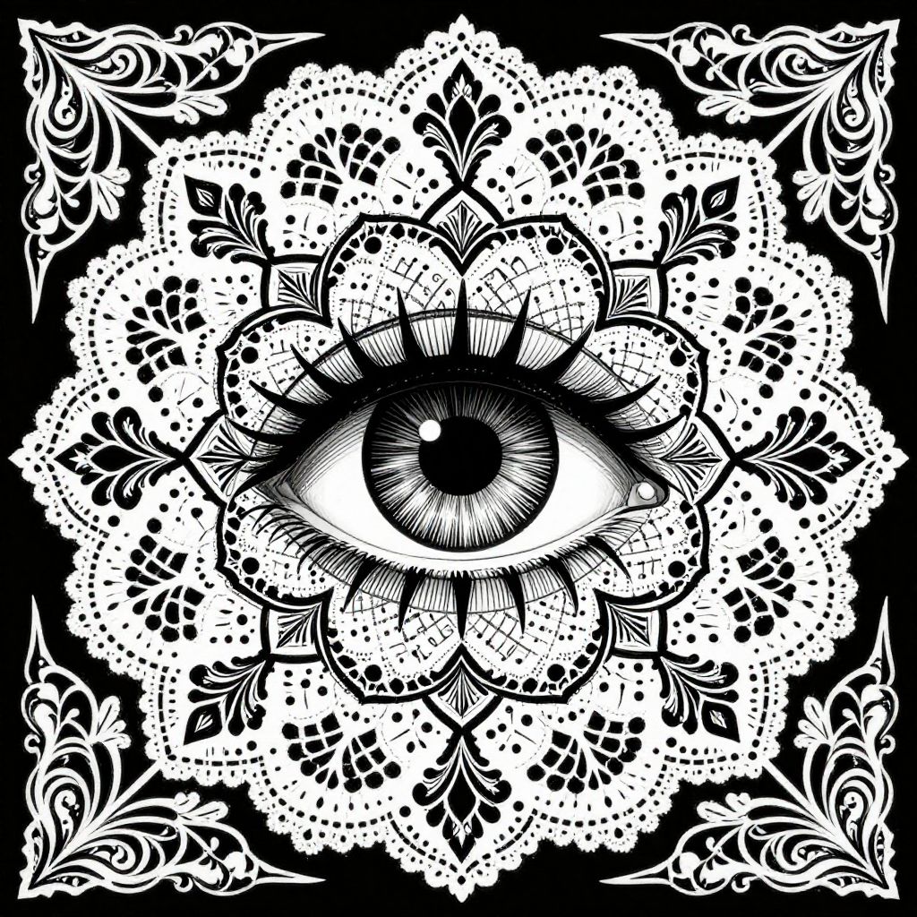 This is a digital black-and-white drawing featuring a detailed, central eye with intricate, radial lines converging to the pupil. Surrounding the eye, there's an elaborate, lace-like pattern with floral and paisley motifs. The design is highly symmetrical, with ornate, swirling patterns in white on a solid black background. The eye appears to be the focal point, surrounded by delicate, lace-like textures and dotted accents, creating a surreal, almost hypnotic visual effect. The style combines elements of mandala and biomorphic art, with a focus on contrast and intricate detailing.