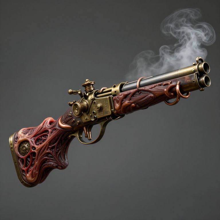 A steampunk-inspired flesh gun, merging Victorian firearm design with grotesque organic growths, veins and muscle fibers entwined with brass and copper pipes, emitting faint steam